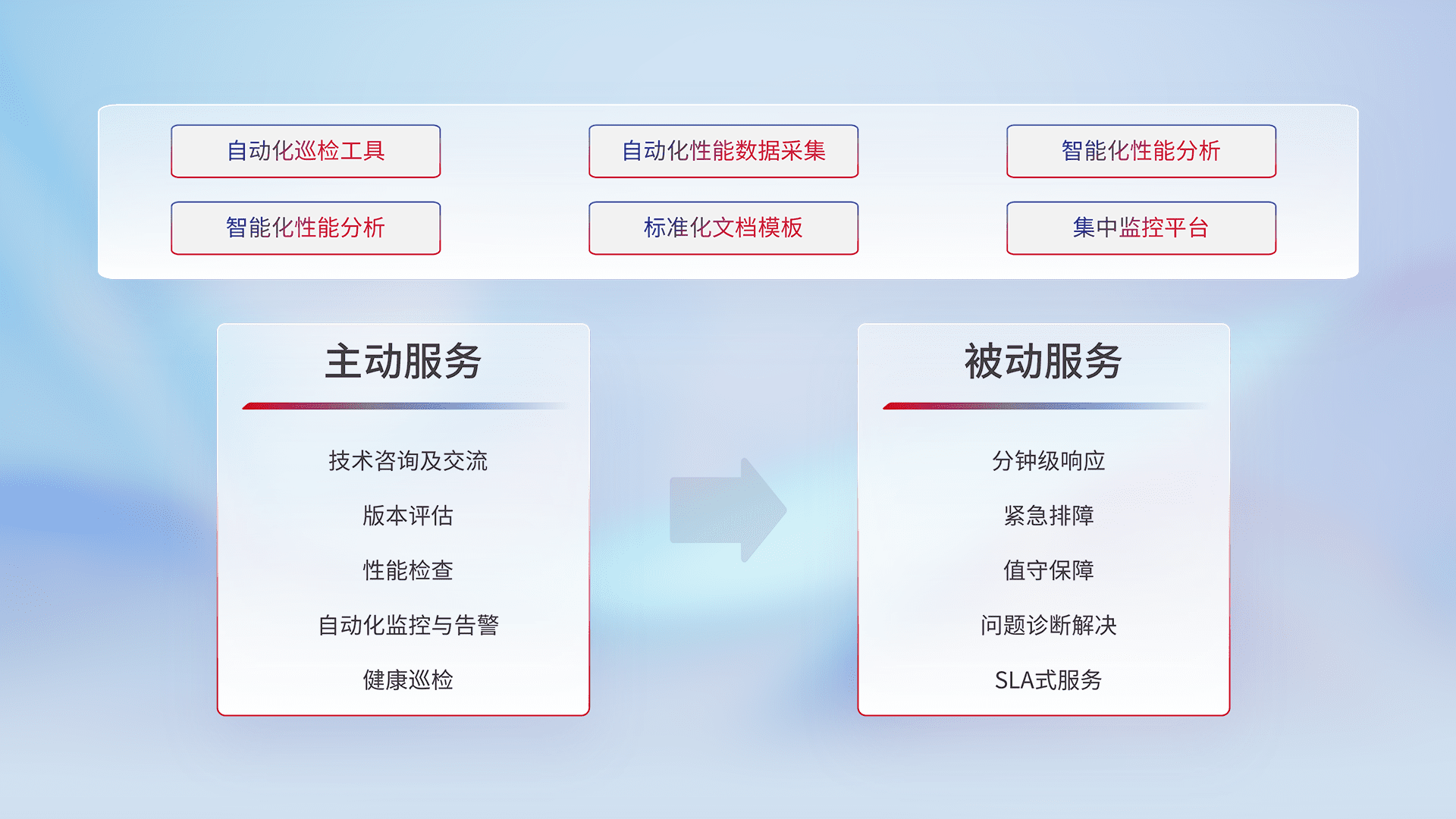 智能化工具和标准化文档,,,,保障服务质量,,,提供主动服务(包含技术咨询、、版本评估、、、、性能检查、、、自动化监控与告警、、、健康巡检)和被动服务包含(分钟级响应、、、紧急排障、、、、值守保障、、、、问题诊断解决、、SLA服务)。。。。