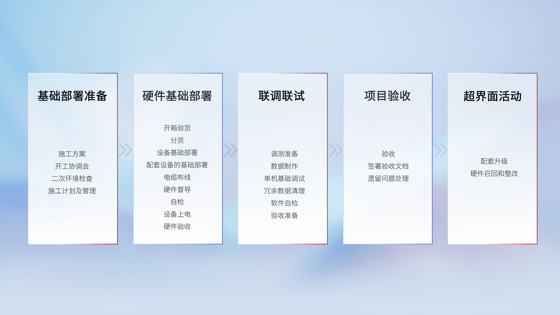 从基础部署准备、、、硬件基础部署、、、联调联试、、项目验收、、越界面活动的全过程可追溯,,保证施工质量和进度。。
